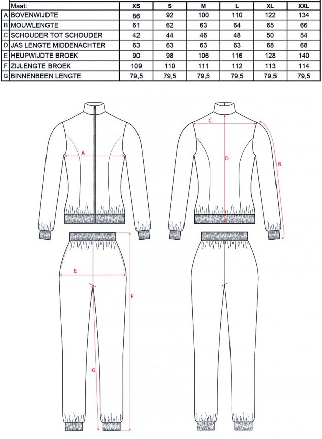 There is an elastic band in the sleeves, hem of the jacket and the end of the trouser legs. Jacket closes with a zipper on the front. The pants have an elastic band in the hem and have 2 side pockets.