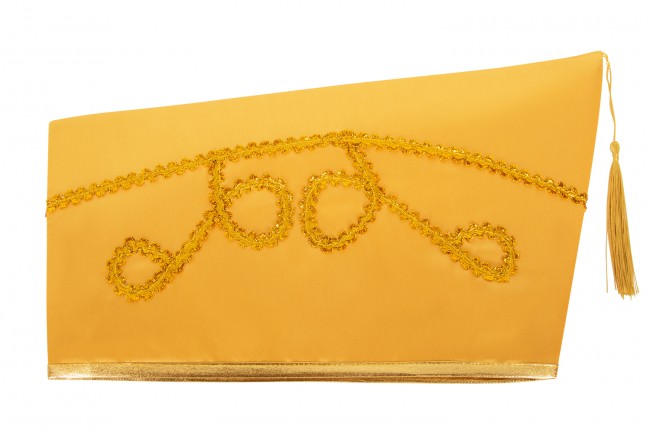 Beautiful committee hat, in the colour Gold and made of a fine shiny fabric.